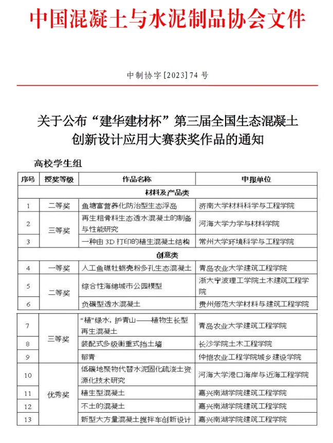 12月25日,由中国混凝土与水泥制品协会主办的“建华建材杯”第三届全国生态混凝土创新设计应用大赛落下帷幕,由公司土木2020级本科生陈宏楷带队的《人工鱼礁牡蛎壳粉多孔生态混凝土》(指导教师:全洪珠教授)、农业工程2022级研究生王姝带队的《“植”绿水,护青山—植物生长型再生混凝土》(指导教师:全洪珠教授)两件作品,分别获高校员工组创意类一等奖、三等奖。