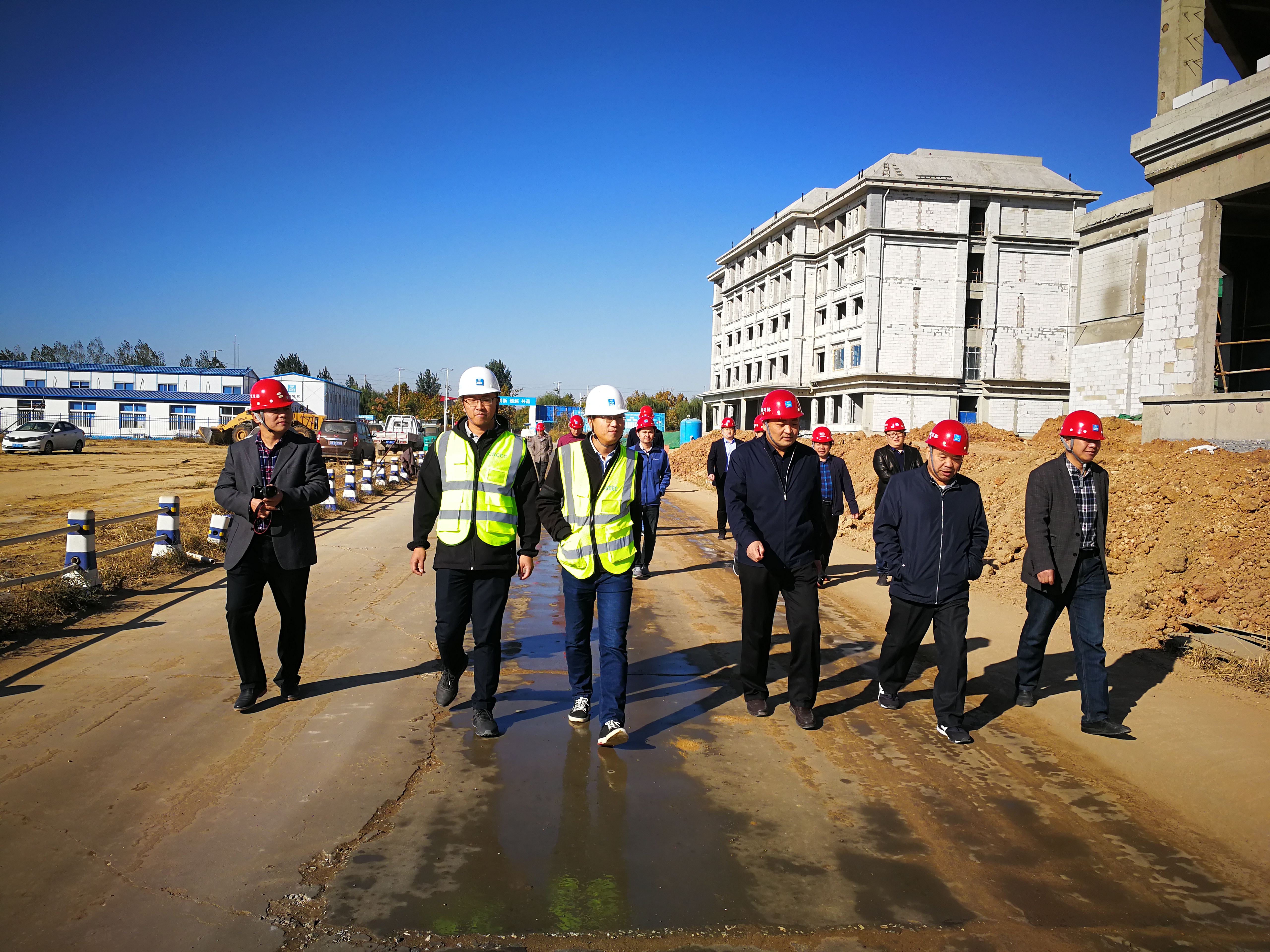 公司第二党支部党员教师和民主党派教师在公司基建处处长刘富强和中建八局、铁建二十局等建设单位负责人的带领下,对平度校区在建的教学楼、办公楼、宿舍、报告厅等建筑设施进行实地参观调研,对校园规划及建设情况进行了解。参观过程中老师们和施工单位技术人员就施工技术、施工方案、生产设备等方面进行了详细深入的学习交流,并对建设过程中存在的问题进行研究探讨。