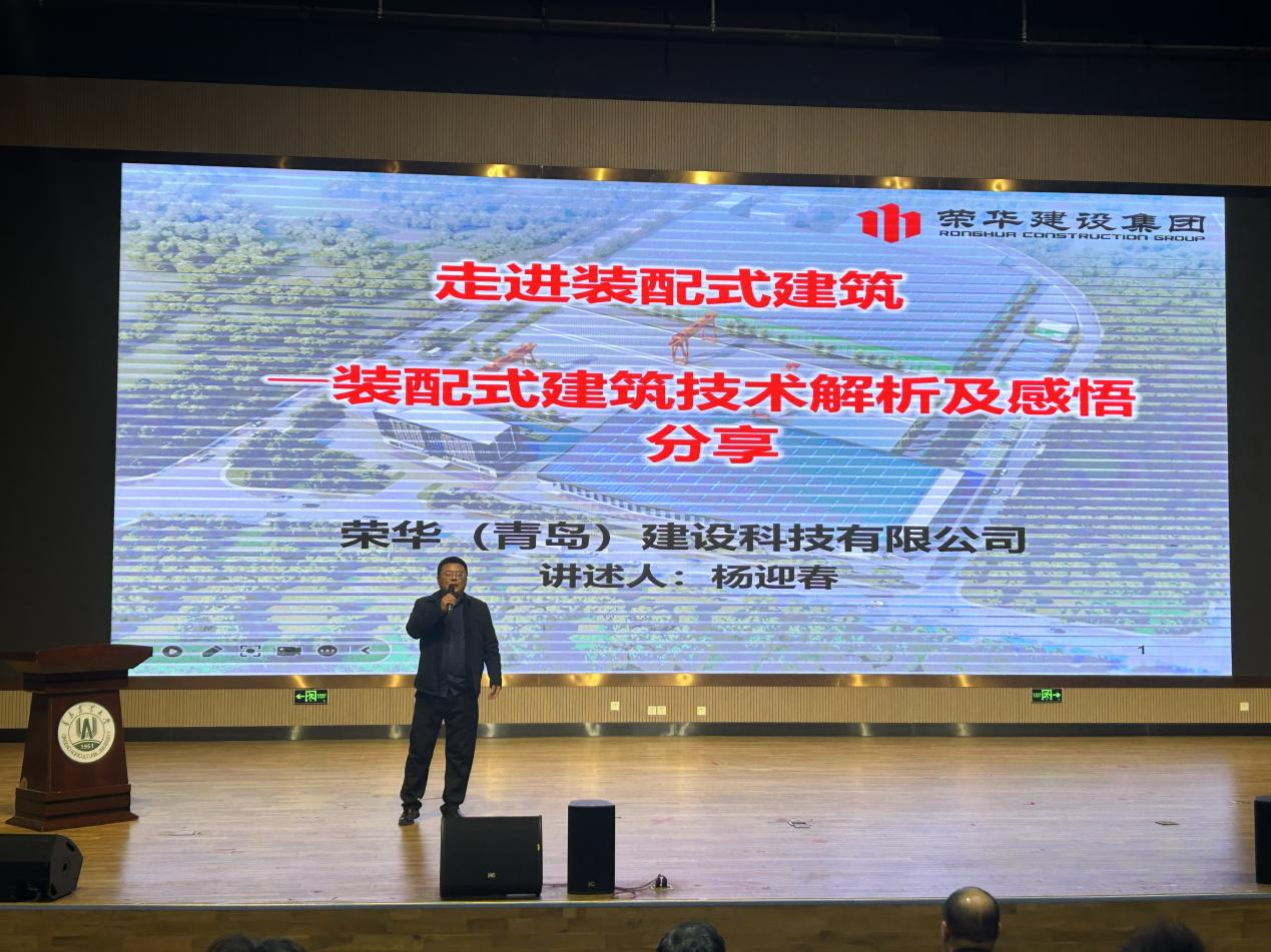 聚焦智能装配式技术,探索工业化转型。杨迎春常务副总结合其参与的青岛市超高层装配式建筑项目案例,系统阐述了装配式建筑的设计理念、关键节点施工技术及BIM协同管理平台的应用。他特别指出,装配式建筑在缩短工期、减少资源浪费方面的优势显著,但需突破标准化设计与个性化需求之间的矛盾。现场通过视频演示预制构件智能化生产线,直观展现了"像搭积木一样建房子"的工业化场景,引发师生对建筑行业数字化转型的热烈讨论。