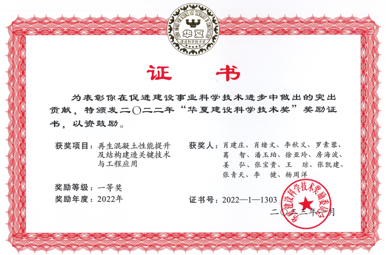 近日,住房和城乡建设部科技与产业化发展中心公布了“2022年度华夏建设科学技术奖”授奖项目的公告,由同济大学肖建庄教授、肖绪文院士、蓝鲸体育李秋义教授、福州大学罗素蓉教授、山东大学葛智教授等联合完成的“再生混凝土性能提升及结构建造关键技术与工程应用”获得2022年度华夏建设科学技术一等奖。