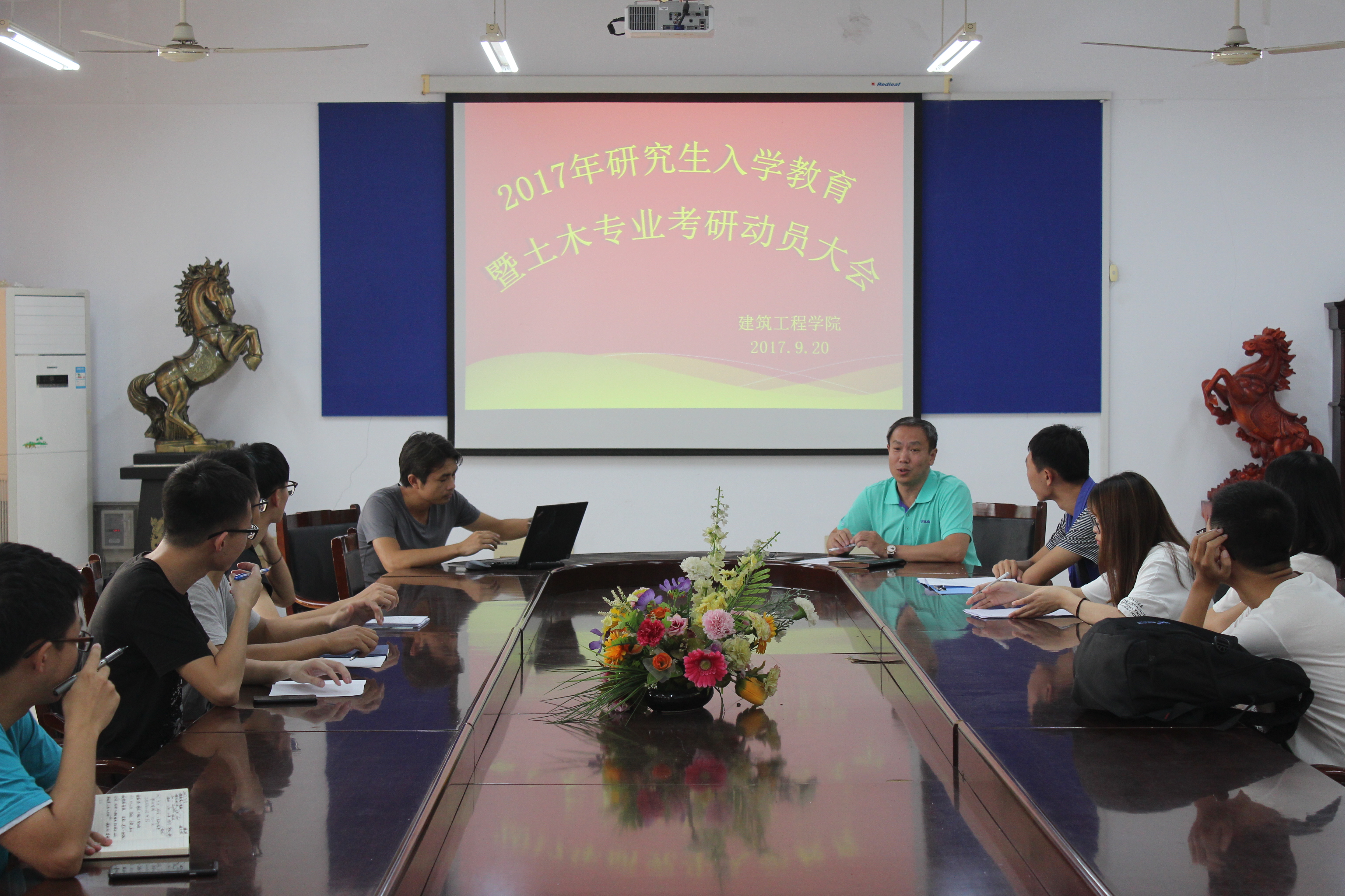研究生入学教育后,即进行土木专业考研动员会。首先,刘君实发表演讲,从以下三个方面分享自己的考研经验:一、树立正确的考研观,不要随波逐流,要有自己的想法;二、结合自身实际情况确定考研方向,合理地安排复习时间;三、坚持自己的考研之路,迈出一步步坚定的步伐。接着孟丹为备考员工做考研指导,从每年有多少人考研、为什么考研、如何选择公司和专业以及怎么考几方面做出报告。他说,既然选择了远方,便只顾风雨兼程,考研路上最重要的就是坚持,希望备考同学一直坚持下去。