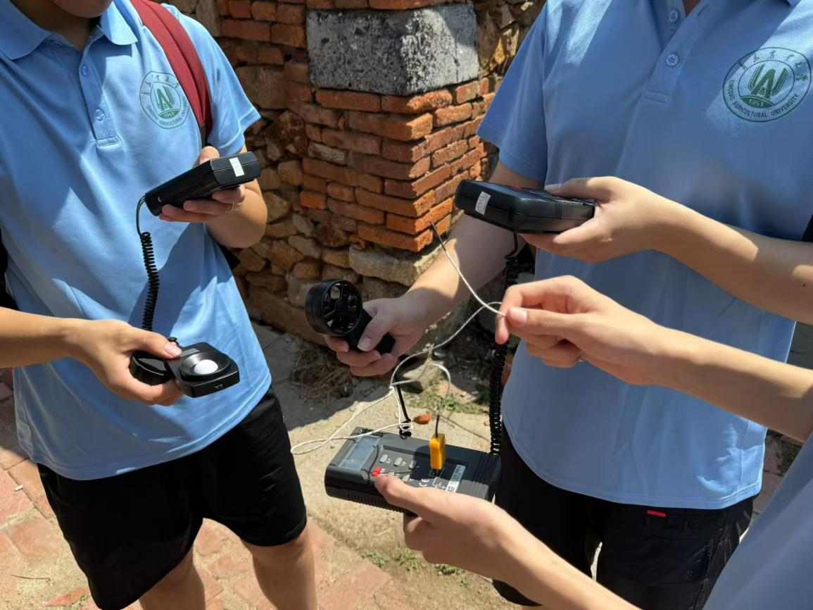 带着精准测量的决心,实践团成员们手持仪器穿梭在晓翁村的街巷与院落间,用数据为乡村安全“画像”。在光照测量中,我们分时段记录房屋不同点位的采光数据;噪声测量覆盖了住宅内多个方位,鲜明的对比让团队更清晰地意识到改造既要经济,也要兼顾安静和舒适;而风速仪和温度表在不同方位的读数同样藏着学问,这些数据或许能成为老房改造的突破口。“每一组数据都连着村民的生活质量。”成员们在笔记本上认真标注着测量数据,手中的仪器仿佛变成了“听诊器”,倾听着乡村建筑的“脉搏”。