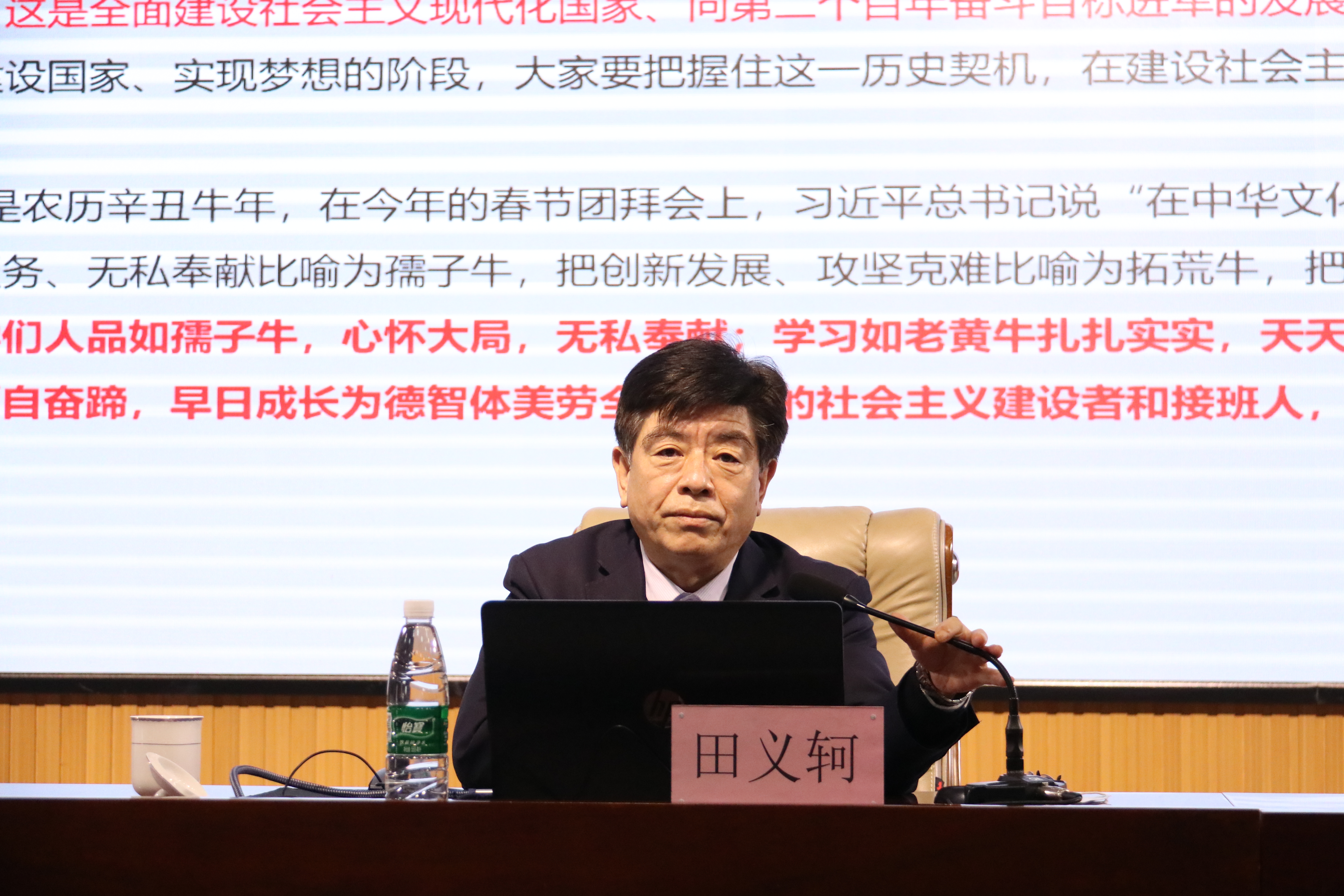 田义轲以“青春心向党,奋进新时代”为题,从“疫情阴霾下的2020年,中国答卷惊艳世界”、“抗疫斗争波澜壮阔,重大战略成果倍应珍惜”、“疫情防控持之以恒,青春向党书写华章”三个方面作了重点解读。他通过一组组数据和一个个事例指出,面对突如其来的新冠肺炎疫情,党和国家始终把人民的生命安全和身体健康放在首位,彰显了中国力量,中国效率。这一年抗疫情、防洪涝,促改革、推开放,抓脱贫、惠民生,保增长、稳大局,同时,全面建成小康社会取得伟大历史性成就,脱贫攻坚任务成功如期完成,交出了一份令全世界羡慕的满意答卷。面对疫情,中国人民风雨同舟、众志成城,抗疫斗争铸就了生命至上、举国同心、舍生忘死、尊重科学、命运与共的伟大抗疫精神,阐释了“跟党走”的深刻内涵。田义轲表示,今年是中国共产党成立100周年,大家要结合党领导的抗疫斗争,从历史和现实、理论和实践上深入学习"党史",做到学史明理、学史增信、学史崇德、学史力行。