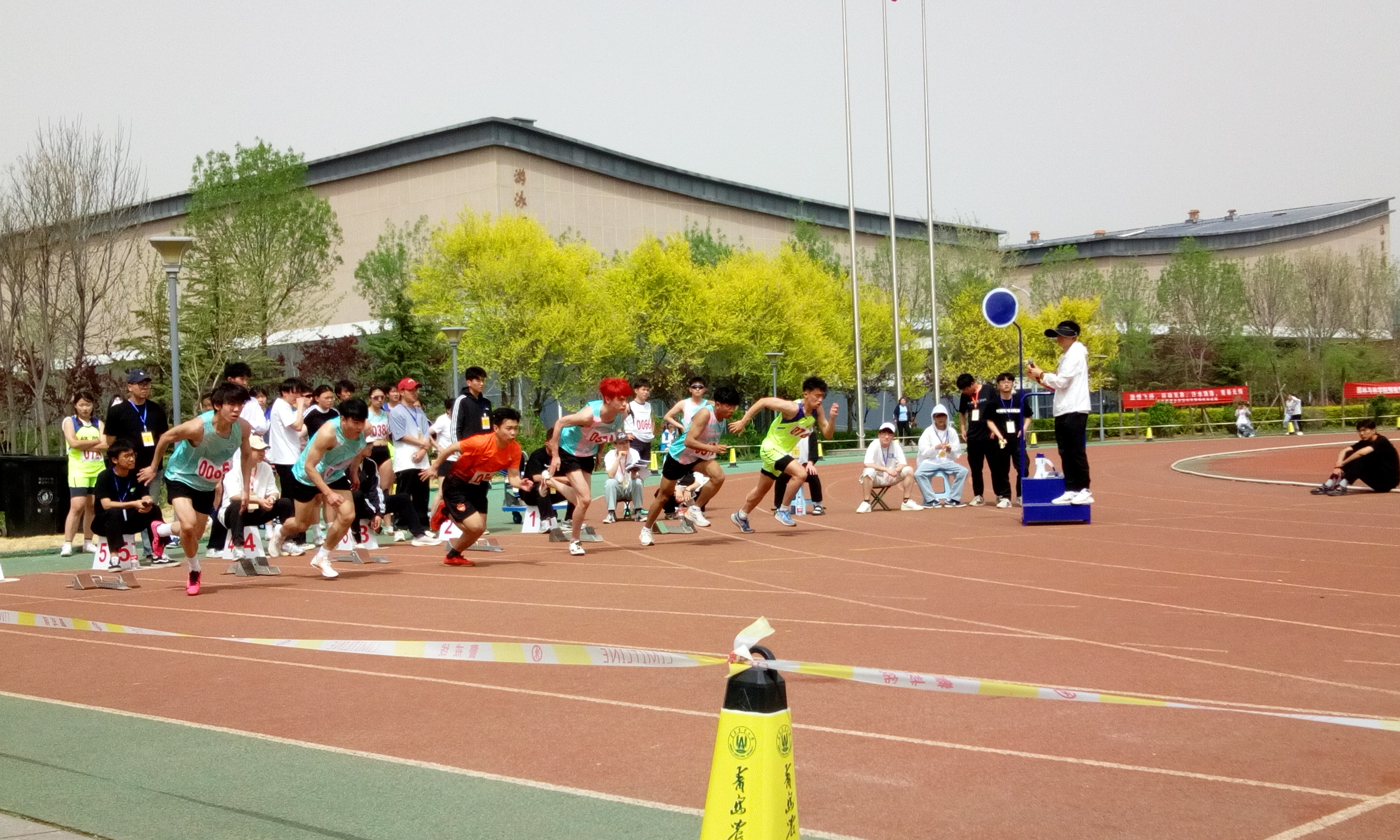 赛场内外,温情与激情交织。观众席上,“建工加油”的呐喊声此起彼伏,啦啦队手持彩球随音乐起舞,用跃动的身影为选手注入能量;后勤团队穿梭于场地之间,递水、搀扶、记录瞬间,志愿者们的红马甲成为最安心的存在;裁判员紧盯计时器,以严谨公正守护赛事秩序。当男子5000米选手冲过终点时,志愿者第一时间上前搀扶;教工组比赛间隙,员工们为老师送上矿泉水与掌声——这些细微之处,凝聚成建工人最温暖的底色。