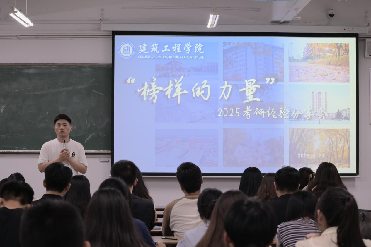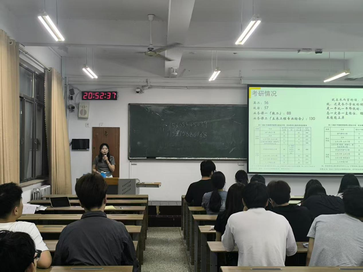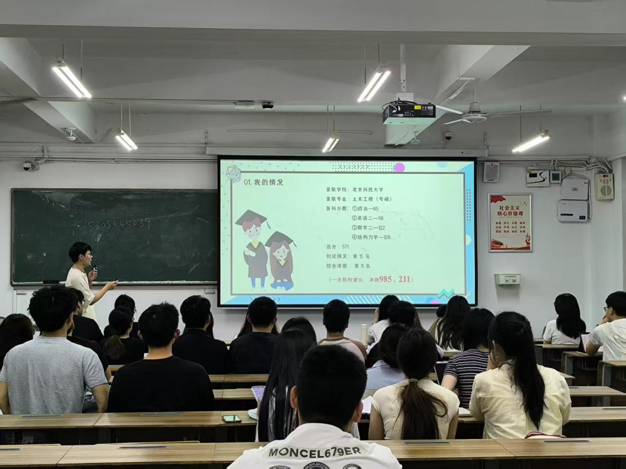 2025年5月21日晚,蓝鲸体育"榜样的力量"考研经验分享会在教学楼C区201教室成功举办。本次活动特邀建环、建筑学、土木工程、工程造价四个专业的优秀考研学子代表,为在场百余名同学带来了一场干货满满的备考经验分享。公司辅导员老师渠非出席活动,与同学们共同聆听这场富有启发性的经验交流会。